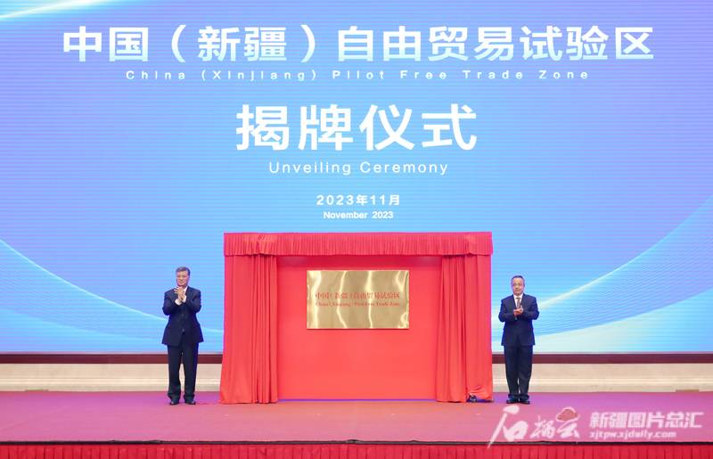 11月1日,自治区党委书记、兵团党委第一书记、第一政委马兴瑞,自治区党委副书记、自治区主席艾尔肯·吐尼亚孜共同为中国(新疆)自由贸易试验区揭牌。天山网-新疆日报记者 崔志坚摄