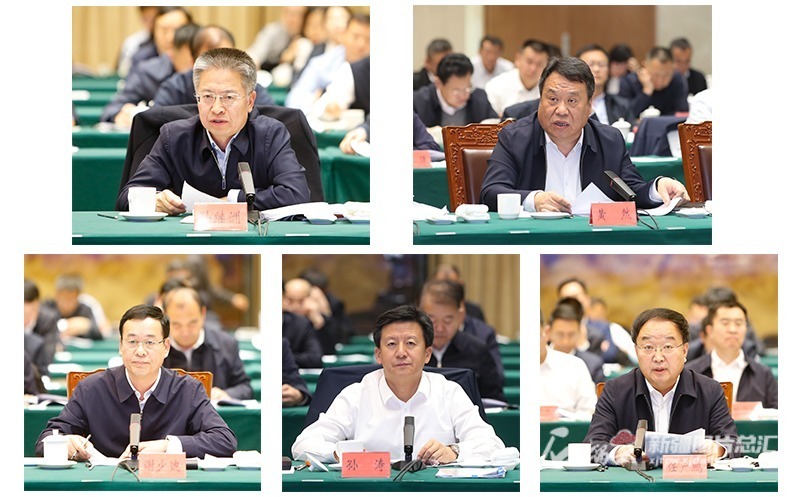 会上,自治区自然资源厅、兵团自然资源局负责同志汇报了新一轮找矿突破战略行动工作情况。阿勒泰地区、哈密市、巴音郭楞蒙古自治州负责同志介绍了矿产资源勘查开发措施、成效及下一步工作方向(从左至右,从上至下)。石榴云/新疆日报记者 崔志坚摄