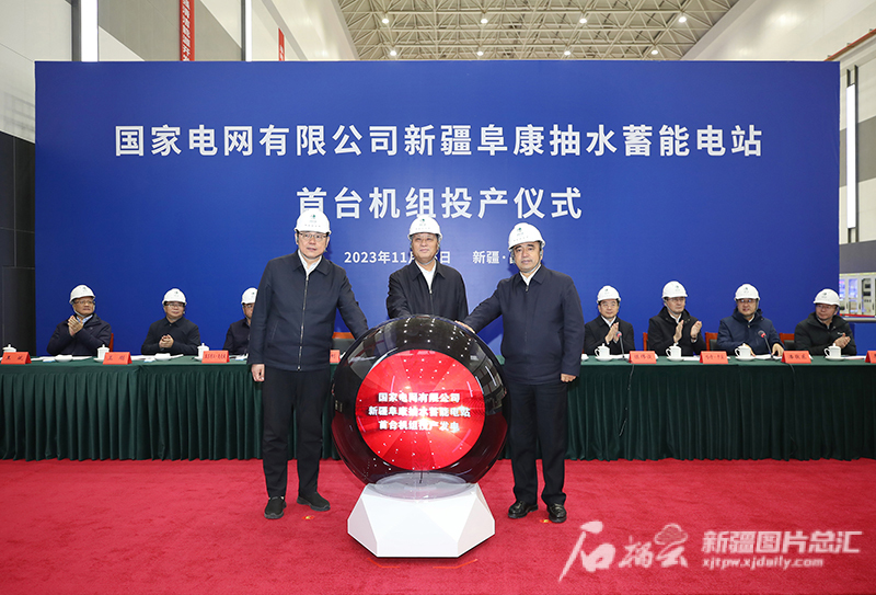 11月25日,国家电网阜康抽水蓄能电站一号机组开机发电,我国西北首台抽水蓄能机组正式投产。这是自治区党委书记马兴瑞(中)、自治区主席艾尔肯·吐尼亚孜(右)、国家电网有限公司总经理张智刚共同启动首台机组投产发电运行。天山网-新疆日报记者崔志坚 摄