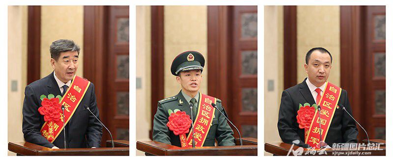 伊犁哈萨克自治州、陆军边防某团、吐鲁番市托克逊县夏镇巴扎尔社区有关同志,代表模范城(县)、单位和个人发言。
