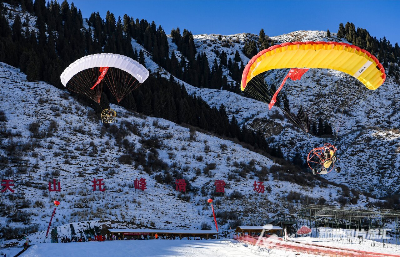 2023年12月24日,游客在天山托峰滑雪场乘坐动力伞游玩。周鹏 摄