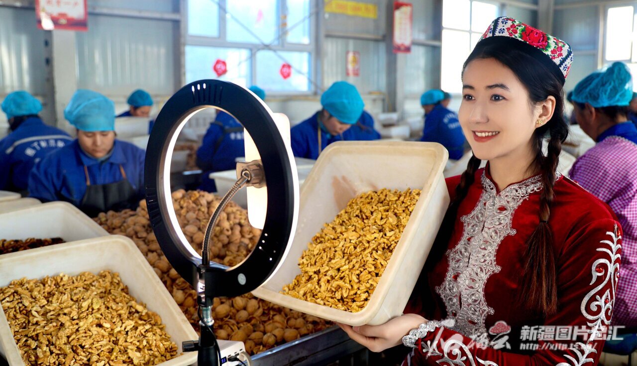 2023年12月7日,乌什县电子商务公共服务中心工作人员利用网络直播销售核桃干。外力·克依木 摄