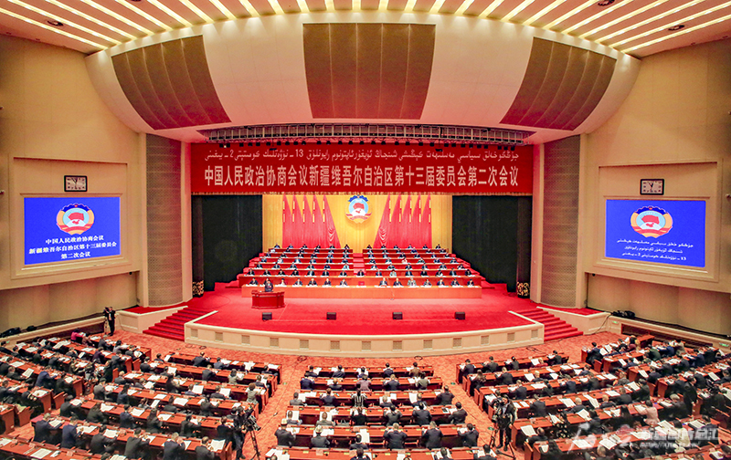 1月29日,中国人民政治协商会议新疆维吾尔自治区第十三届委员会第二次会议在新疆人民会堂开幕。图为会议现场。天山网-新疆日报记者 蔡增乐摄