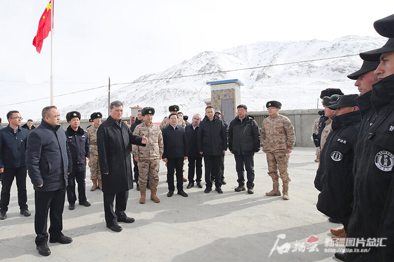 2月3日,自治区党委书记马兴瑞、自治区主席艾尔肯·吐尼亚孜来到喀什地区塔什库尔干塔吉克自治县边境一线,深入边防连队、海关国门等调研,看望慰问高原部队官兵、护边员和基层工作人员等,代表自治区党委和政府,向新疆各族干部群众致以美好的新春祝福。这是马兴瑞、艾尔肯·吐尼亚孜在新疆军区红其拉甫边防连亲切看望官兵。 □天山网-新疆日报记者崔志坚摄