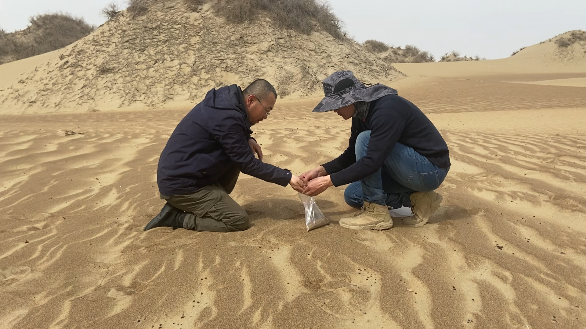 中科院新疆生地所科研人员在塔克拉玛干沙漠东部片区采样(资料图片)。图/中科院新疆生地所提供