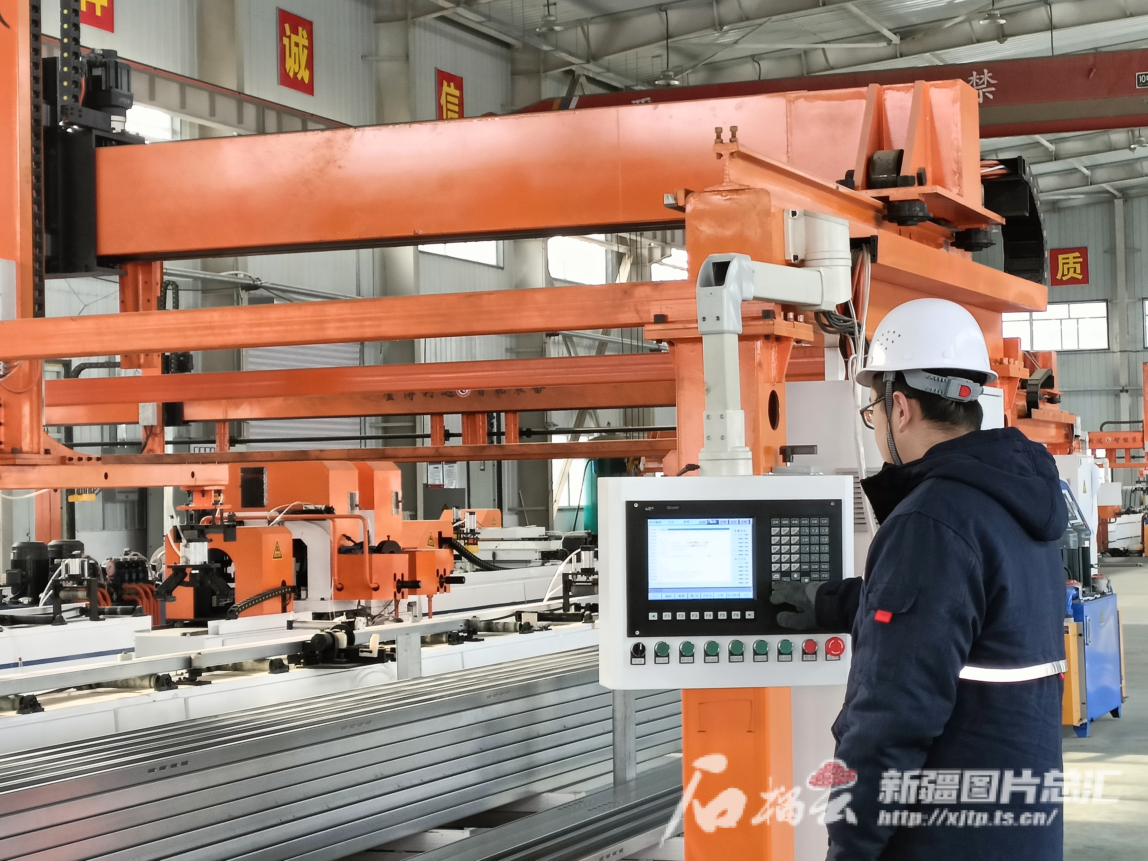 3月7日,在位于昌吉国家高新技术产业开发区的新疆中瀚顶达环保科技有限公司,智能生产线正在生产光伏支架。刘茜 摄