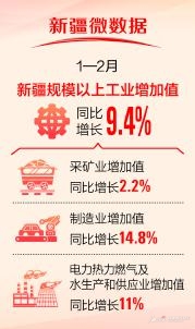 天山网-新疆日报讯(记者高峰报道)记者从自治区统计局获悉:1—2月,新疆规模以上工业增加值同比增长9.4%,增速同比提高0.6个百分点,高于全国2.4个百分点。