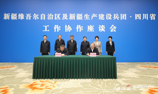4月7日,新疆维吾尔自治区及新疆生产建设兵团·四川省工作协作座谈会在成都召开。图为四川省委副书记、省长黄强,自治区党委副书记、自治区主席艾尔肯·吐尼亚孜代表两省区签署《新疆维吾尔自治区人民政府 四川省人民政府战略合作框架协议》。天山网-新疆日报记者 崔志坚摄
