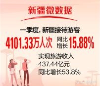 天山网-新疆日报讯(记者姚刚报道)记者从自治区文化和旅游厅获悉:今年一季度,新疆接待游客4101.33万人次,同比增长15.88%;实现旅游收入437.44亿元,同比增长53.8%,一季度实现开门红。