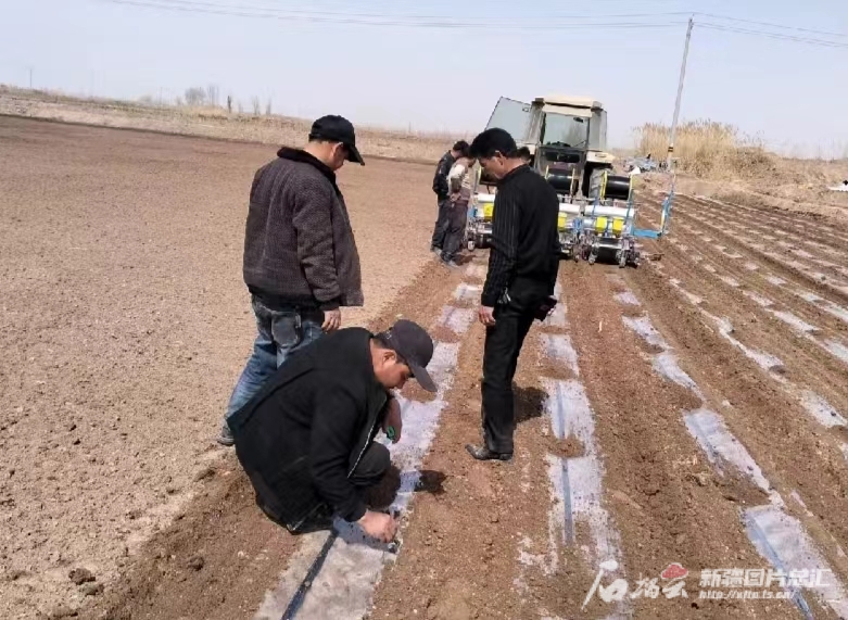 3月31日,在伽师县英买里镇巴格托格拉克村,农技人员正在查看甜菜播种质量。蒋崇海 摄