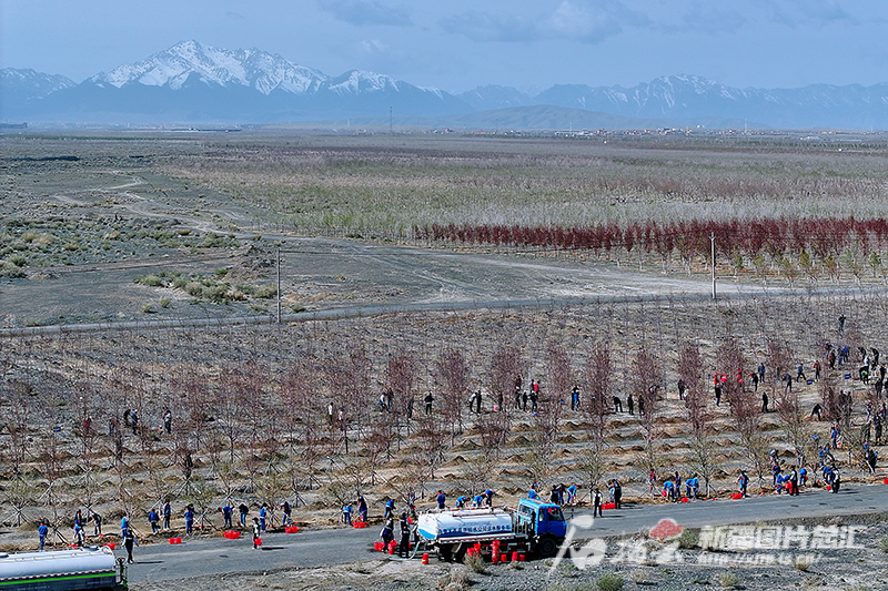 4月24日,各族干部群众在乌鲁木齐县乌板乌水公路两侧生态防护林建设工程现场,开展义务植树活动。闫鹏摄