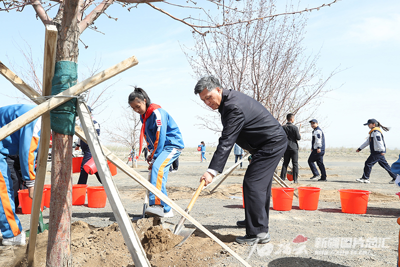 天朗气清、惠风和畅。在和煦的春风中,各族干部群众协力种树,一派忙碌景象。马兴瑞、艾尔肯·吐尼亚孜等自治区领导一下车便加入到植树队伍中,同乌鲁木齐市党员干部、少先队员等一同劳动。填土围堰、提水浇灌,大家接连种下一株株海棠、苹果等树种。