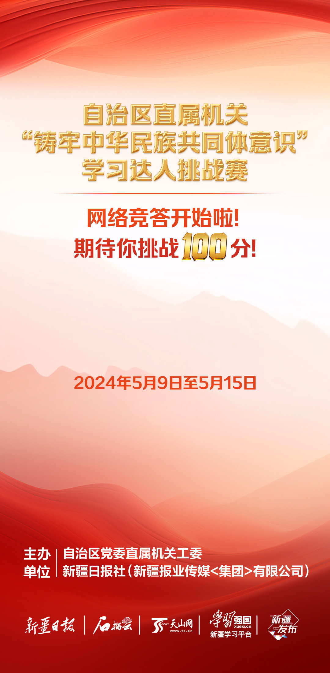 天山网-新疆日报讯(记者任江报道)自治区直属机关“铸牢中华民族共同体意识”学习达人挑战活动将于5月9日正式开赛。届时,100余家自治区直属机关和14个地州市直属机关的党员干部职工均可参加。