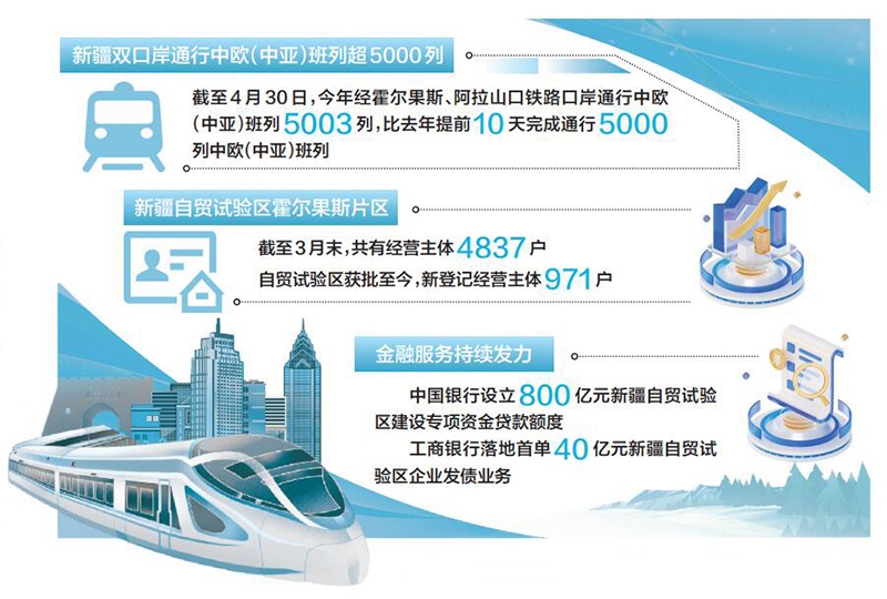 截至4月30日,2024年经霍尔果斯、阿拉山口口岸通行中欧(中亚)班列达5003列。新疆双口岸比去年提前10天完成通行5000列中欧(中亚)班列。