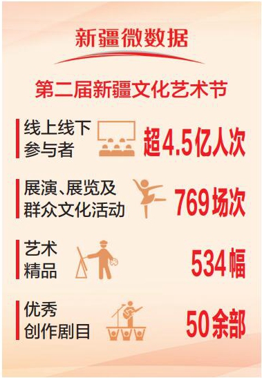 本届文化艺术节荟萃50余部优秀剧目,汇集534幅艺术精品,全疆联动开展各类文化活动769场,近100万人次走进剧院、美术馆,来到广场、社区、公园,共享视听盛宴,文化艺术百花齐放,以美育人、以文化人,春风化雨、润物无声,温润着新疆各族人民的精神世界,激荡着人们的文化自信。