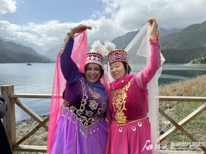 5月13日,在天山天池景区,代表团成员、阿拉伯研究院副教授拉娜·穆罕默德(左)换装体验浓郁的民族风情并与游客合影。刘媛摄