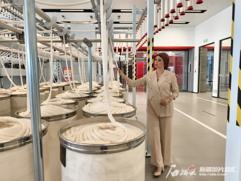 5月15日,在卓郎新疆智能机械有限公司生产车间,代表团成员、金字塔门户网记者达利亚·阿提亚查看智能化纺织设备。石榴云/新疆日报记者 李嘉妮摄