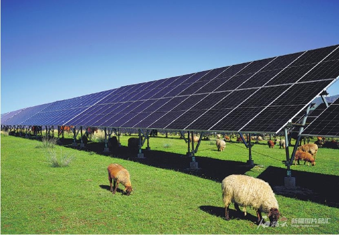 新疆中绿电尼勒克县400万千瓦风光项目中的光伏工程为“牧光互补”项目,在工程设计时对光伏支架进行了升高处理,保证羊群能在光伏板下自由穿行,实现了板上发电、板下牧羊的土地综合利用,区域综合效益显著提升。“光伏板可以起到降低风速、防风阻沙、减少水分蒸发的作用,能改善土壤墒情,对草原生态环境起到保护作用。”新疆中绿电尼勒克项目负责人武会蔷说,“牧光互补”模式使牧民收入来源不再以传统养殖业为主,还可以从光伏发电产业中获利。