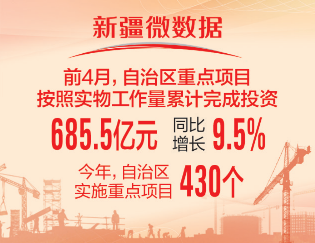 天山网-新疆日报讯(记者石鑫报道)记者从自治区发展改革委获悉:1—4月,自治区重点项目按照实物工作量累计完成投资685.5亿元,同比增长9.5%。