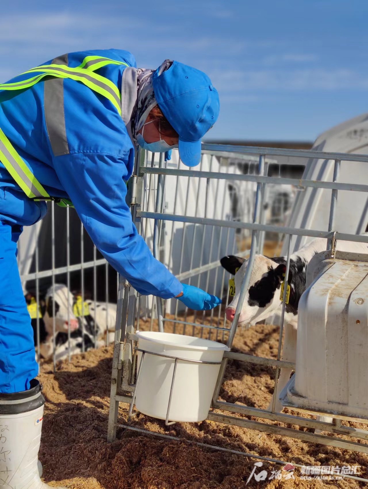 在位于昌吉市阿什里哈萨克族乡的昌吉市现代畜牧产业园内现代牧业(昌吉)有限公司养殖场,饲养员正在喂养小牛犊。胡雅宁 摄