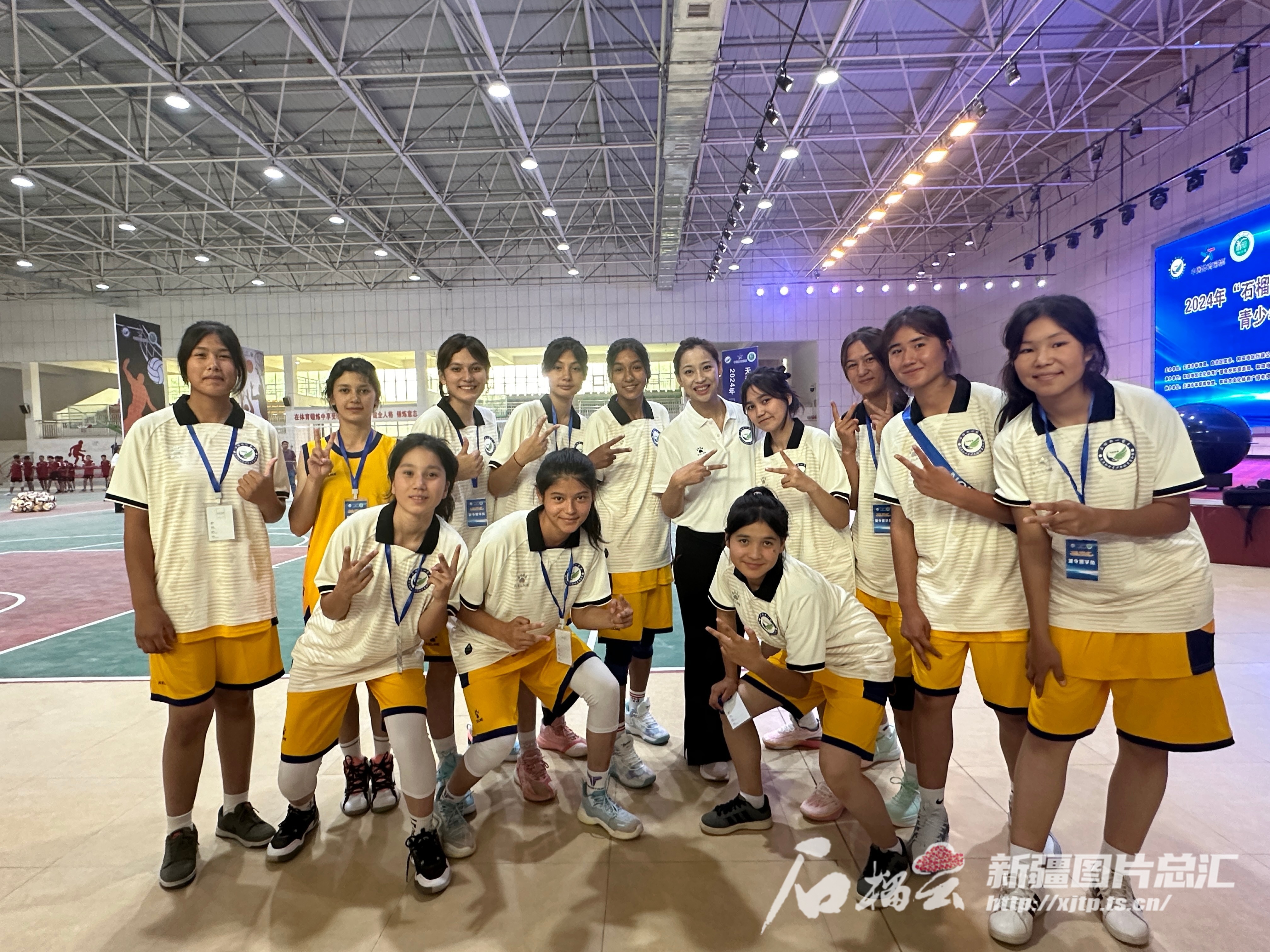 7月18日,为期十天的2024年“石榴籽一家亲”暨天津和田青少年体育夏令营,在和田地区中等职业技术学院开营。图为和田女排运动员与来自天津的王茜教练合影。宋俞霖摄