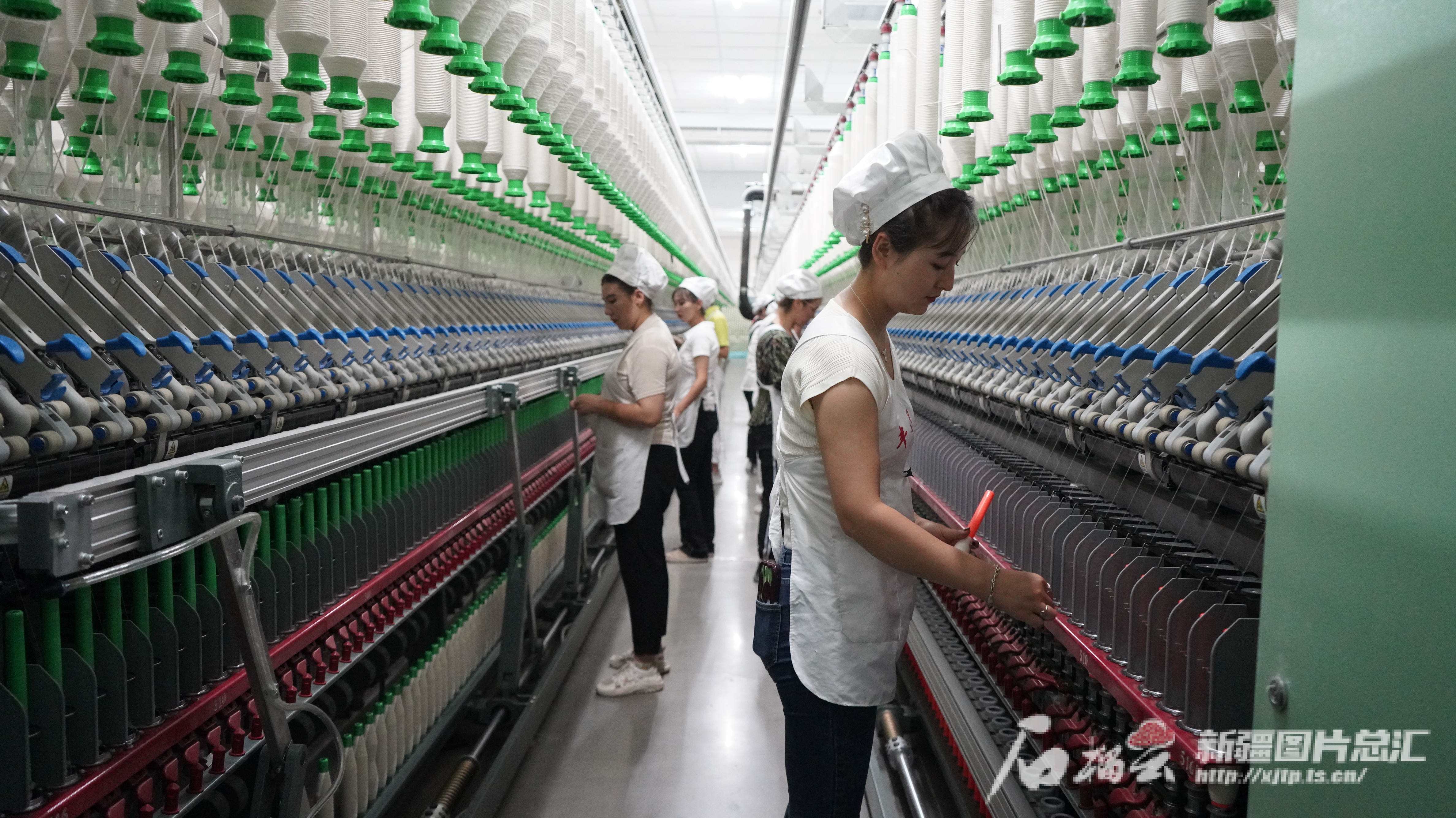 7月10日,在皮山县安徽(三峡)工业园区内的和田丰昌泰纺织科技有限公司生产车间,工人正在查看纱线。阿卜杜米吉提·阿卜拉摄