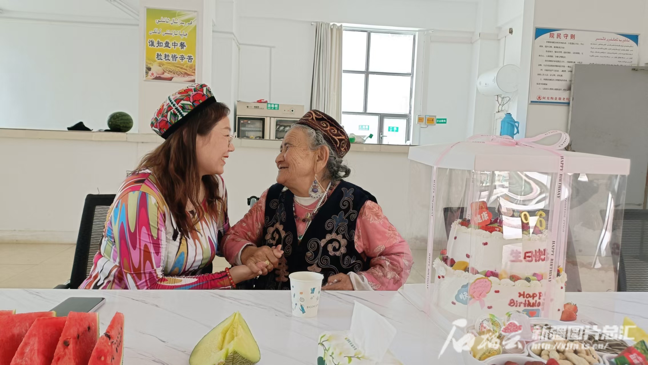 5月20日,在阿克陶县中心敬老院食堂里,李红米(左)为再娜普·尤努斯庆祝生日。本人供图