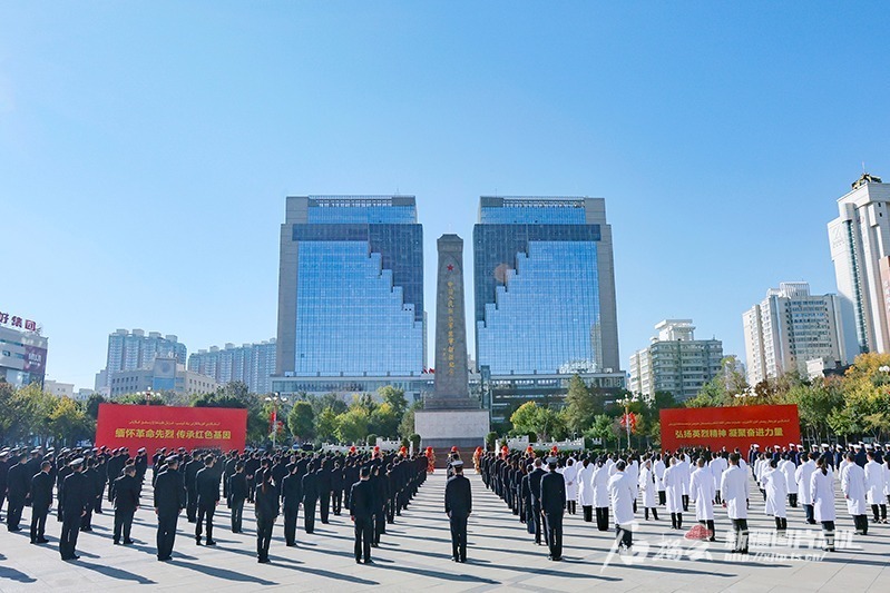 丰碑永存,激扬浩然正气。精神不朽,激励前行脚步。乌鲁木齐人民广场上,中国人民解放军进军新疆纪念碑巍然耸立。纪念碑正前方,排列着以自治区党委,自治区人大常委会,自治区人民政府,自治区政协,新疆军区,新疆生产建设兵团,各民主党派、自治区工商联和无党派人士,乌鲁木齐市各族各界群众,少先队员名义敬献的9个花篮。各族各界代表整齐列队。