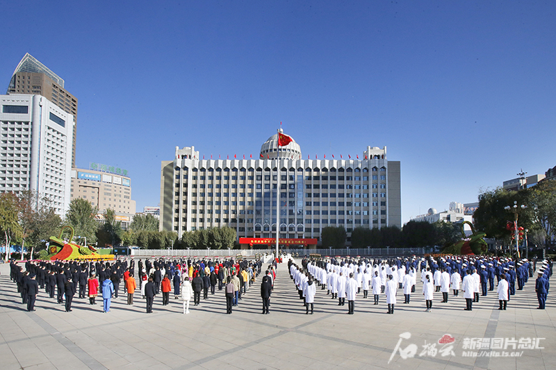 10月1日,自治区在乌鲁木齐隆重举行升国旗仪式,庆祝中华人民共和国成立75周年。石榴云/新疆日报记者 谢龙摄