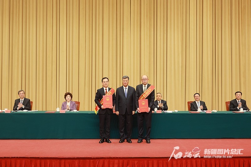 11月20日上午,新疆科技创新大会在乌鲁木齐召开。自治区党委书记、兵团党委第一书记、第一政委马兴瑞为获得自治区科学技术奖特等奖的中石油新疆油田分公司首席专家唐勇(右)和中国科学院新疆理化技术研究所研究员潘世烈颁奖。石榴云/新疆日报记者 崔志坚摄