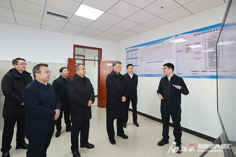 2月5日,自治区党委书记马兴瑞、自治区主席艾尔肯·吐尼亚孜在自治区发展改革委固定资产投资处,听取投资情况介绍,与大家一同分析趋势、研判任务。石榴云/新疆日报记者 崔志坚摄