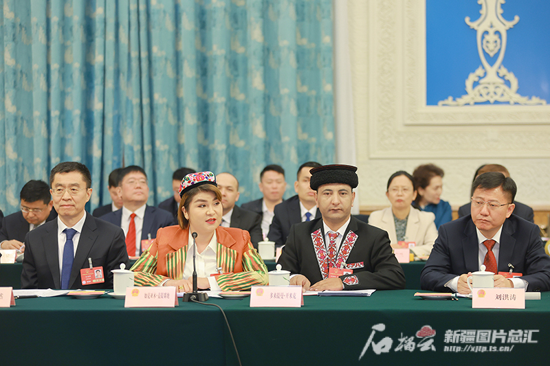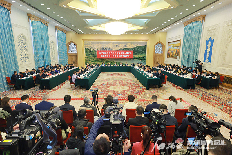 3月7日,参加十四届全国人大三次会议的新疆代表团在人民大会堂新疆厅举行全体会议,继续审查计划报告和预算报告,并向中外媒体开放。石榴云/新疆日报记者 崔志坚摄