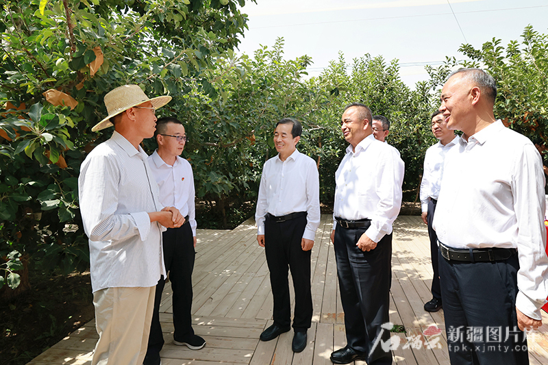 7月5日,自治区党委书记、兵团党委第一书记陈小江,自治区党委副书记、自治区主席艾尔肯·吐尼亚孜走进阿克苏丰庆园农民专业合作社示范园,察看果树长势,了解苹果种植和精深加工情况。石榴云/新疆日报记者 崔志坚摄