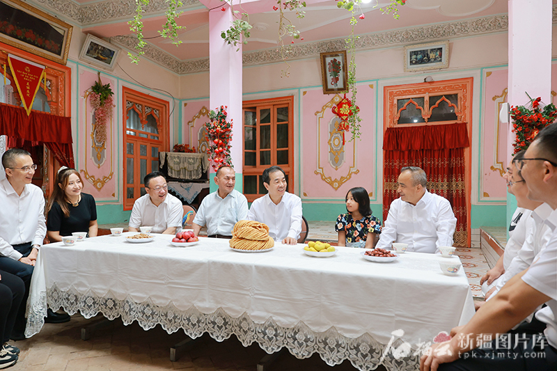 7月22日,自治区党委书记、兵团党委第一书记、第一政委陈小江,自治区党委副书记、自治区主席艾尔肯·吐尼亚孜来到喀什市乃则尔巴格镇前进村看望托乎提·依明一家。天山网-新疆日报记者 崔志坚摄