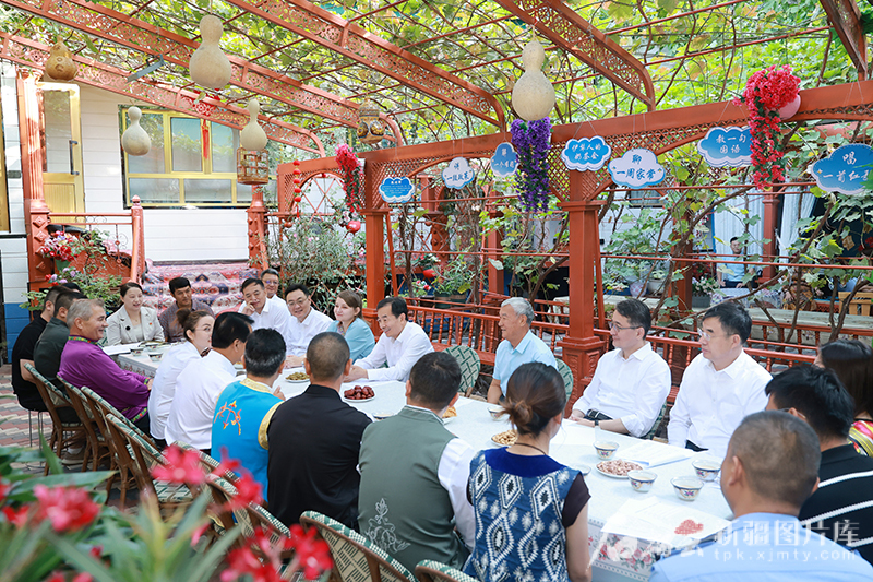 8月6日,自治区党委书记、兵团党委第一书记、第一政委陈小江来到伊宁市六星街社区,同正在开展“伊犁人的奶茶会”的各族群众亲切交谈。天山网-新疆日报记者 崔志坚摄
