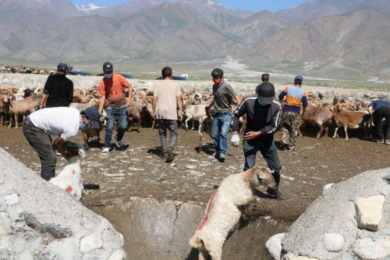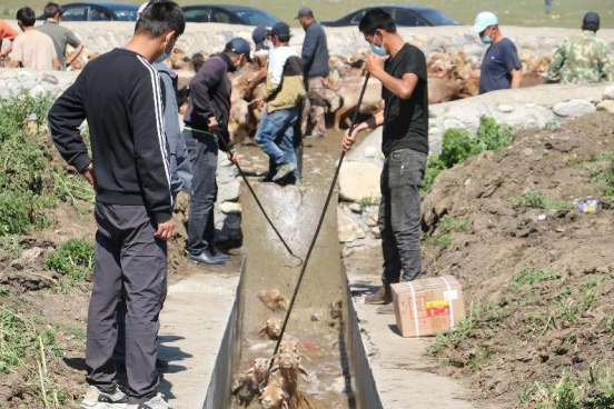 为确保此次防疫工作有序、有效的开展,查干屯格乡组织村级防疫技术人员12人,首先对夏草场转场的约51户牧民的牲畜开展药浴和疫苗注射工作。在羊药浴过程中,技术人员在药浴池两旁手持工具压扶,将羊的头部压入水中保证药浴可以全覆盖,随后工作人员对药浴过的羊群进行疫苗的注射,确保羊群们可以健康的过冬。
