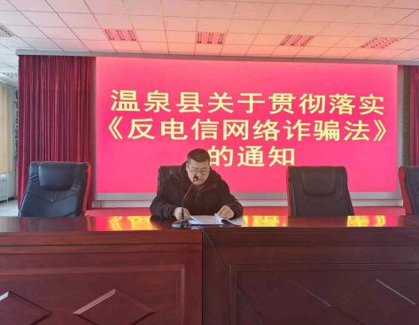 综治办主任王仪俊带领全体机关干部传达学习温泉县关于贯彻落实《反电信网络诈骗法》的通知。向大家宣讲各种诈骗类型的案例,指导下载安装“国家反诈中心”APP。要求全体机关干部注意保护个人隐私,积极向群众宣传反电信网络诈骗知识。