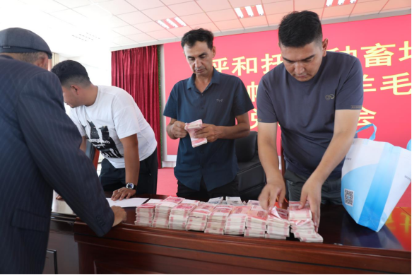 被喊到名字的确肯布勒格队养殖户叶斯布拉提·肖吉汗迈着轻快的步伐,兴高采烈的接过工作人员递上的羊毛款,高兴激动的说:“今年,政府通过多方询价、议价,每公斤羊毛比去年多卖了1.5元,我家比去年多收入5000元,对我们来说是好事,喜事,非常感谢他们。”