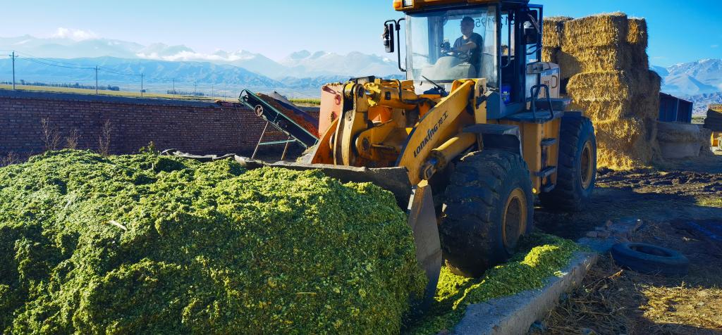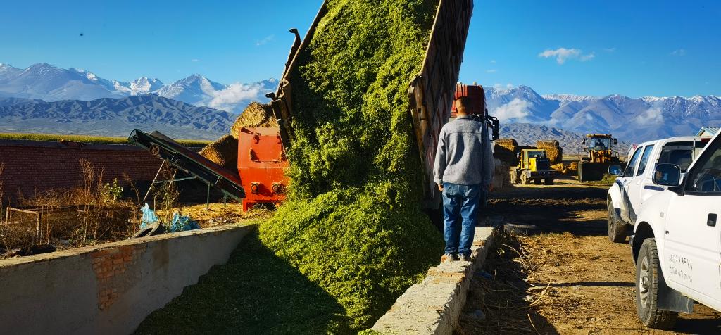 在温泉县查干屯格乡福瑞专业养殖合作社院子内,提前准备好的饲草料垒放的像一座小山,院内整齐地码放着成捆的麦草,一辆辆大卡车运输着带有青草香味的青贮草料往窖里倒入,呈现出一片热闹景象。