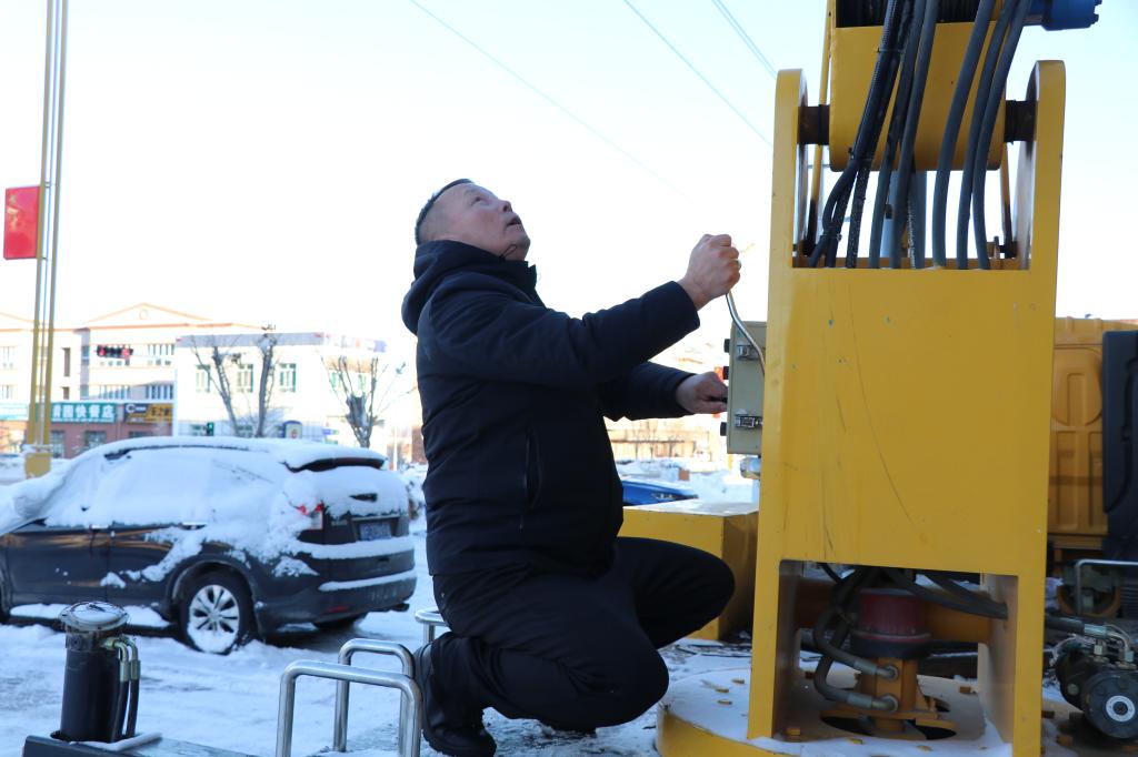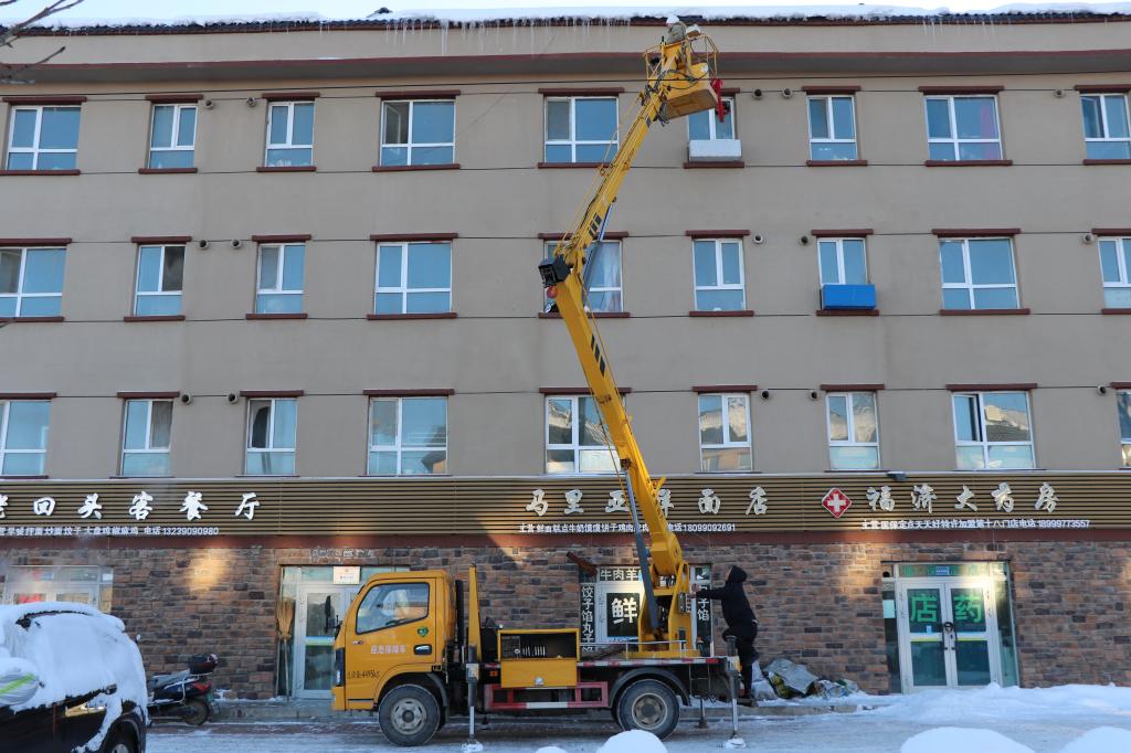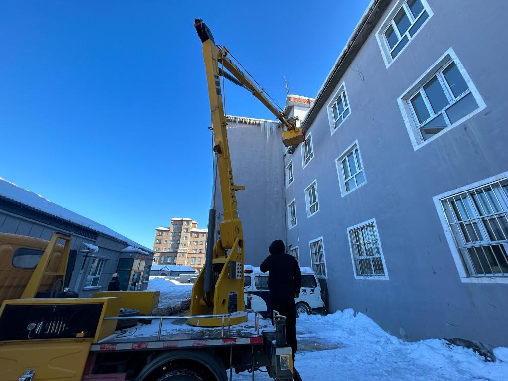在清理过程中,由于部分“冰溜子”位于较高位置,人工难以直接清理,镇政府调来了登高车协助作业。登高车操作员操控着吊臂,将工作人员精准送至高处处置悬冰区域。工作人员在做好安全防护措施的前提下,利用长杆工具、铲子等专业设备,小心翼翼地对屋檐及建筑物外立面的“冰溜子”进行逐一清除。他们不畏严寒、不惧危险,认真细致地完成每一处清理任务,确保隐患不留死角。