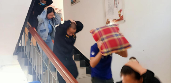早上10:30分,警报声响起,干部用手护住头部,躲避到办公桌底下进行自我保护。当震感减弱,第二声警报响起,干部双手抱头,根据指导人员指挥,按指定疏散路线安全、有序、快速地疏散至院内空旷安全地带,未发生踩踏、碰撞、拥挤事件。