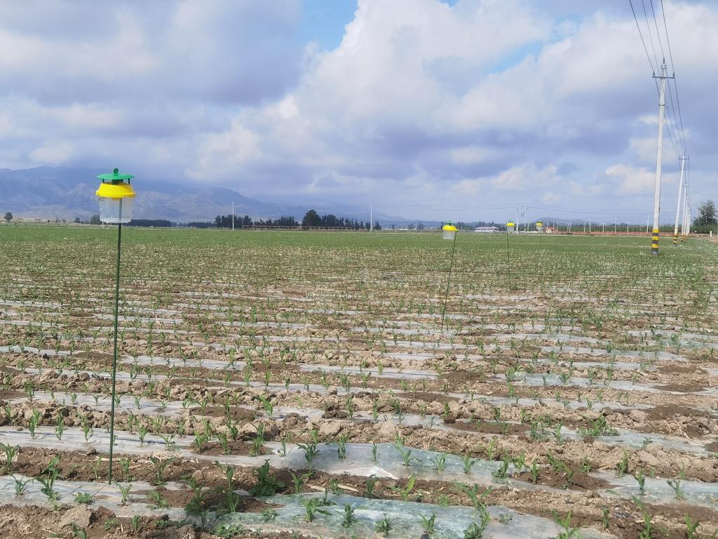 近期,在温泉县的农田里,绿油油的庄稼根壮苗齐,“你看,这就是害虫诱捕器,里面装了不少被俘获的害虫。”温泉县农业技术推广站的工作人员介绍说,“绿色的塑料罩内的诱芯可以吸引害虫自投罗网,有效降低繁殖率,达到灭虫效果。”