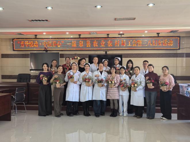 3月6日下午,温泉县农业农村局工会联合县医院中医科,共同举办了以“芳华悦动·中医养心”为主题的“三八”妇女节特别活动。全局90余名干部职工齐聚一堂,在传统中医文化与身心调养的交融中,共度了一个健康、温馨的节日。