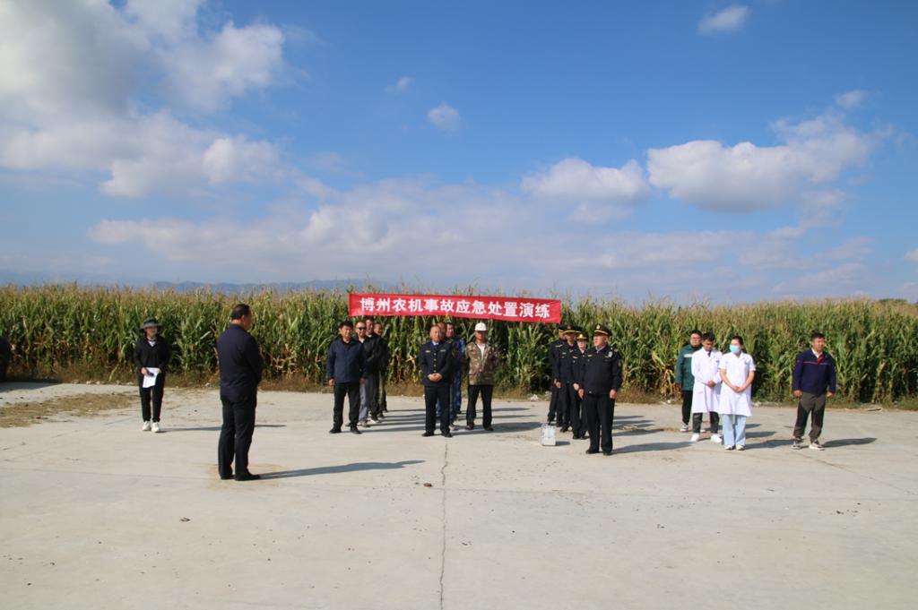 博州农业农村机械化发展中心主任赵大文同志指出此次开展农机事故应急处置演练是检验我州农机监理人员处理突发事故的处置和救援水平一次实测,经过事故报案、案情报告、启动应急预案、救援处置四个部分,充分体现了参演同志反应迅速、运转有序、处置得力、协调一致,达到了预期目的。同时以此次农机安全事故演练为契机,扎实开展落实州农业农村局对“三秋农机安全生产”和“开展三秋农业机械化大培训”工作部署要求,广大农机管理人员要深入学习贯彻习近平总书记关于安全生产重要论述,坚决确保“把人民生命安全放在第一位”,强化农机安全红线意识,切实提高风险隐患排查整改质量,推动农机安全生产责任落实;广大农机服务组织和农机手及时开展农机安全技能培训,牢记安全生产责任,提升农机安全意识。