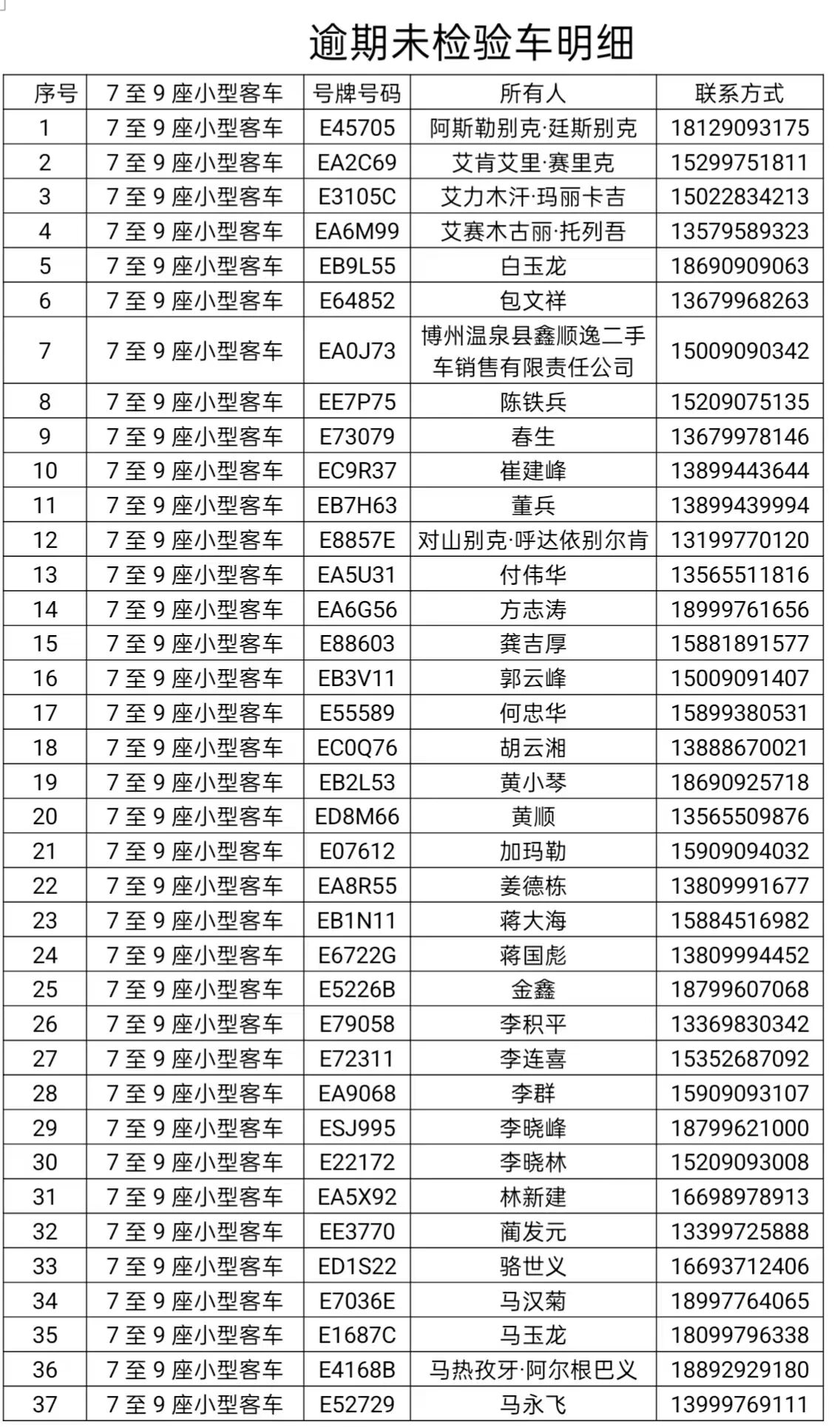为消除道路交通安全隐患,推进源头隐患治理,有效防范和坚决遏制重特大道路交通事故,依据《中华人民共和国道路交通安全法》《中华人民共和国道路交通安全法实施条例》《机动车登记规定》《机动车强制报废标准规定》等相关规定,对登记后上道路行驶的机动车,应当定期进行安全技术检验。驾驶逾期未检验机动车上路行驶的,公安交通管理部门将依法处罚。下列机动车逾期未检验,请尽快办理检验手续。