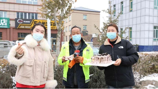 11月22日,志愿者制作的爱心蛋糕上,画出了尽忠职守的警察、勤劳可爱的环卫工人等卡通图案,他们用自己的方式,奉献给这座小镇。正在一线工作的环卫工人张大爷看到蛋糕上的卡通图案后心里非常感动,“看到这么用心做出来的蛋糕,我们吃在嘴里,甜在心里。”