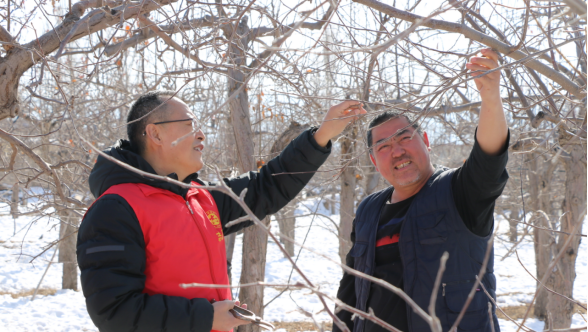 助农生产志愿者们有“技术”。在杨海生家里,安格里格镇“春来发几枝”助农小分队的志愿者们穿梭在果树之间,操起剪刀演示果树剪枝的技巧。托里村村民杨海生说:“我们自己的小庭院种了7亩的果园,以前我们都是按照自己的经验和习惯剪枝,每年水果的产量不高,通过农技科普志愿者的现场指导,规范剪枝操作等规范的养护操作,希望来年果树的产量能够有个好收成”。