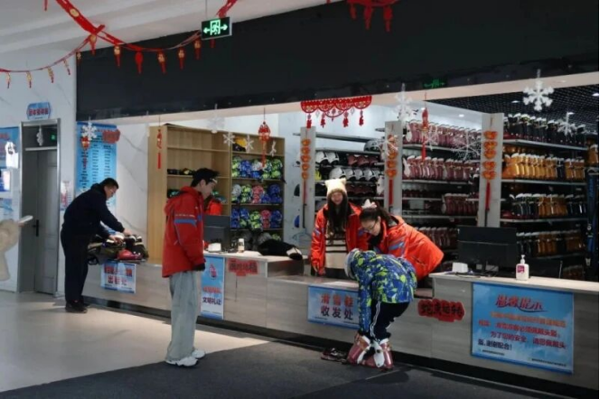 走进占地5400亩的滑雪场,皑皑白雪与天空交相辉映。雪具大厅内,工作人员为游客挑选匹配的雪服雪具;赛道上,初学者在教练指导下练习转弯技巧,熟练掌握技巧的滑雪爱好者则从坡道疾驰而下,划出优美弧线。