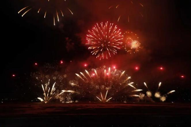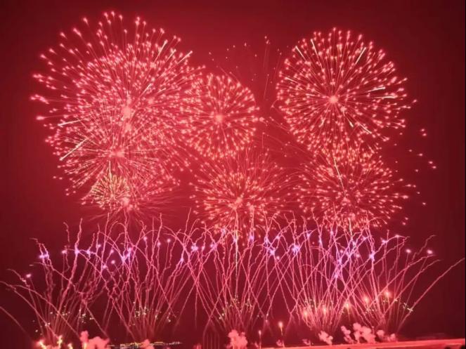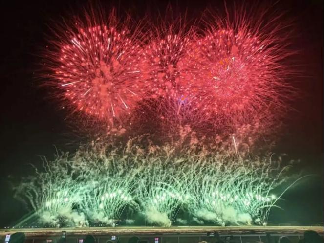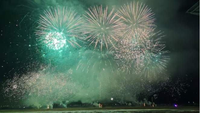 第一篇章“福马迎春启新岁”中,中低空焰火层层攀升、流光溢彩,瞬间点燃全场热情,将新春的喜庆氛围拉满,现场欢呼声此起彼伏。第二篇章“瑞彩呈祥映华光”中,绚烂光影与城市夜景完美融合,尽显温泉县生态底色与发展新貌,将整场表演推向视觉高潮。第三篇章“吉愿祈福佑安康”中,漫天礼花密集绽放,星雨倾泻而下,气势恢宏、震撼夺目,第四篇章“家国同庆耀元宵”将元宵节氛围推向高潮,赞叹声与欢笑声久久回荡在赛马场上空。