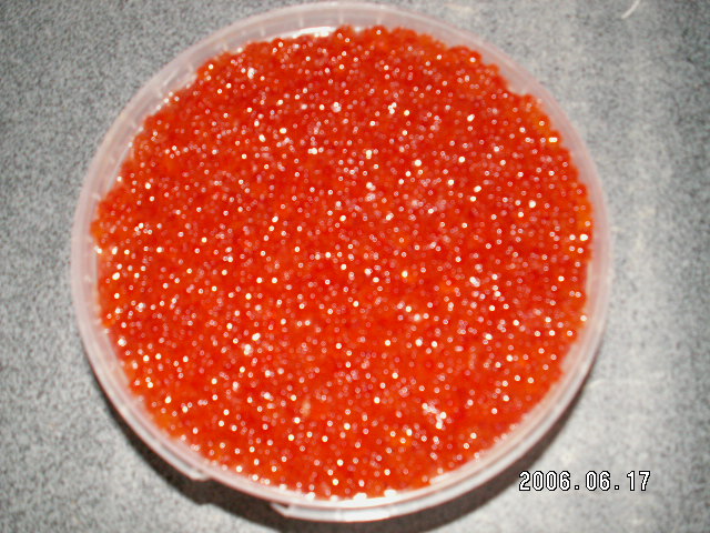 原料:鲑鱼籽。配料:食用盐。制法:将鲑鱼籽撒入盐腌制10-20分钟后即可食用。特点:原汁原味,营养价值极高。